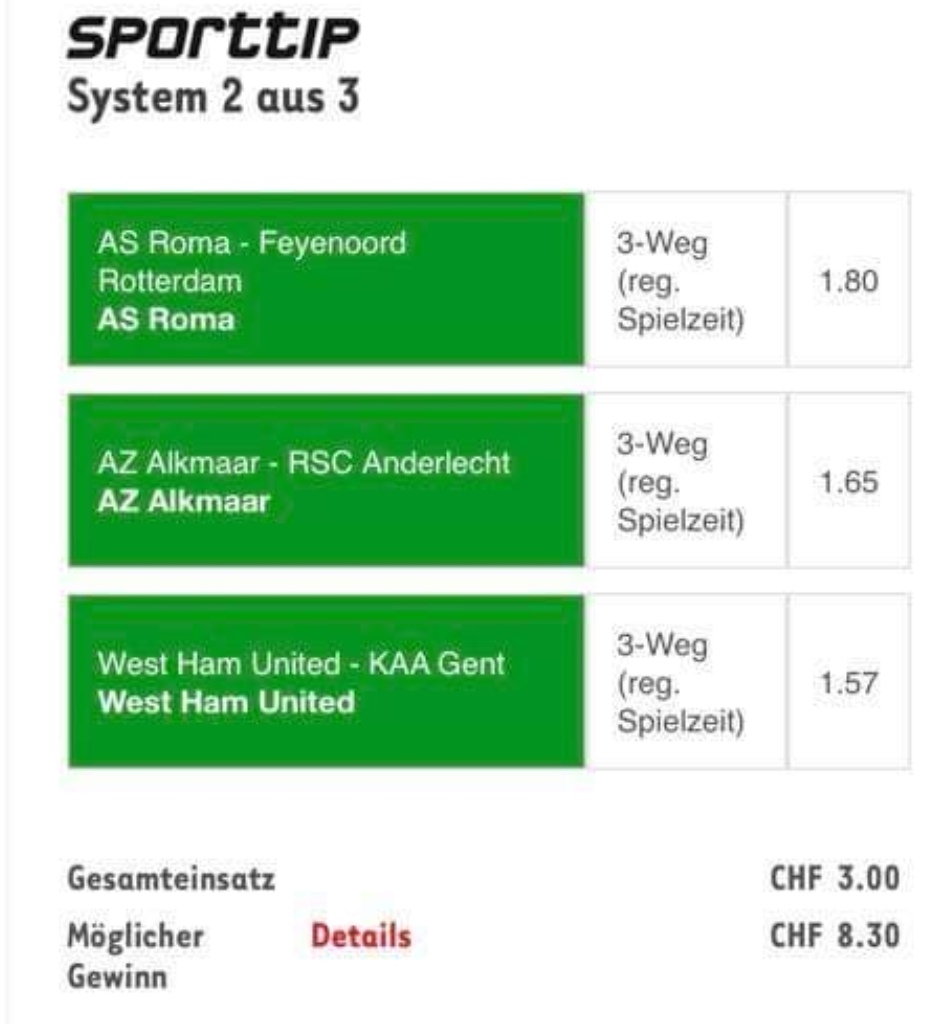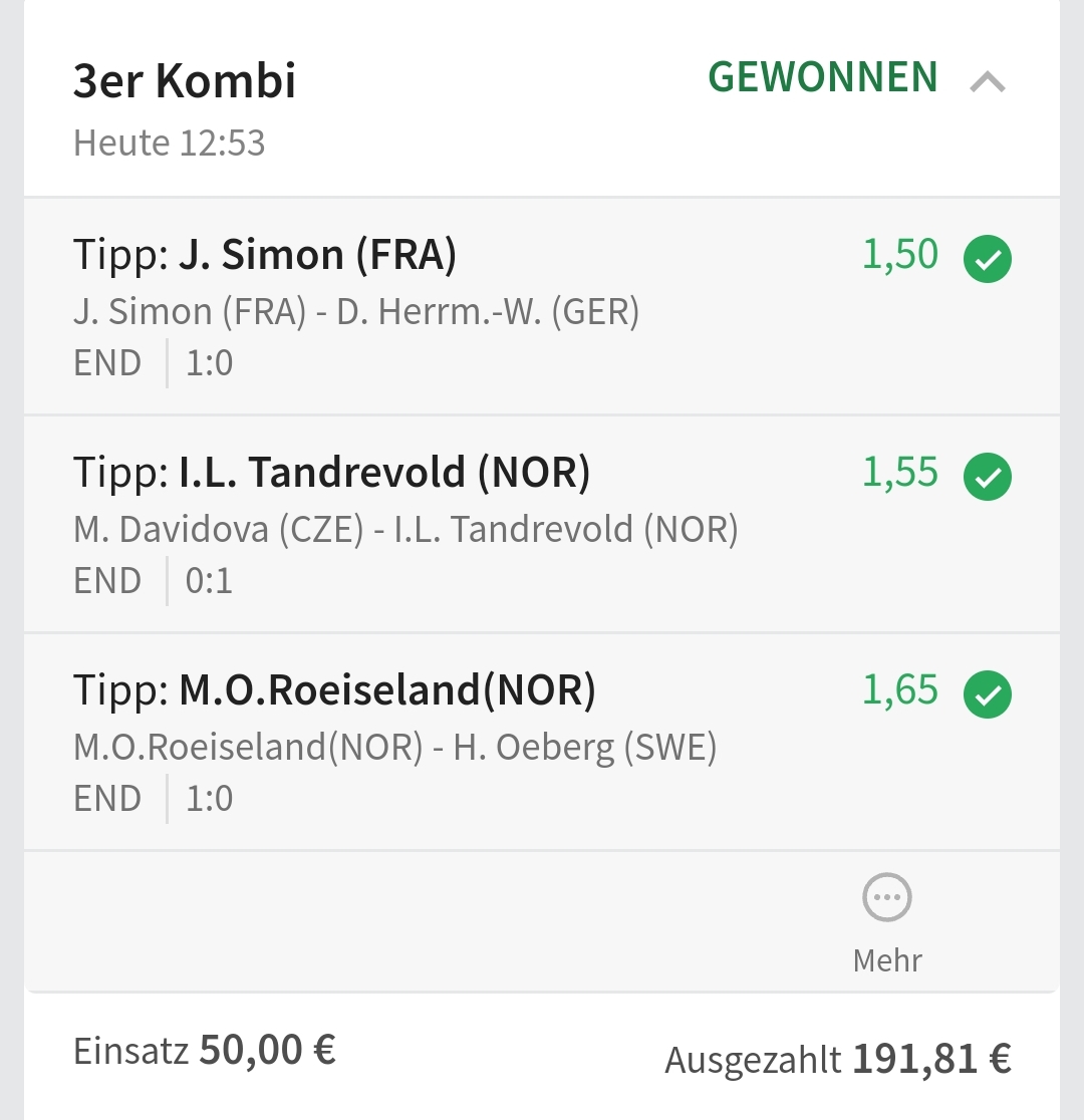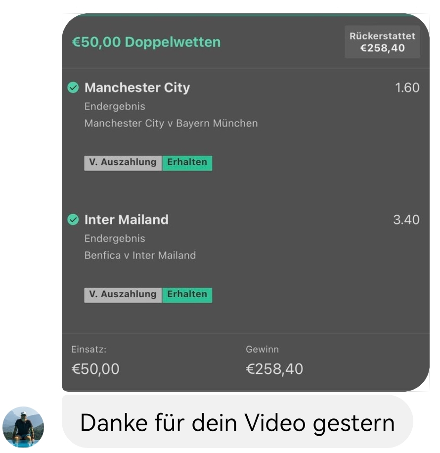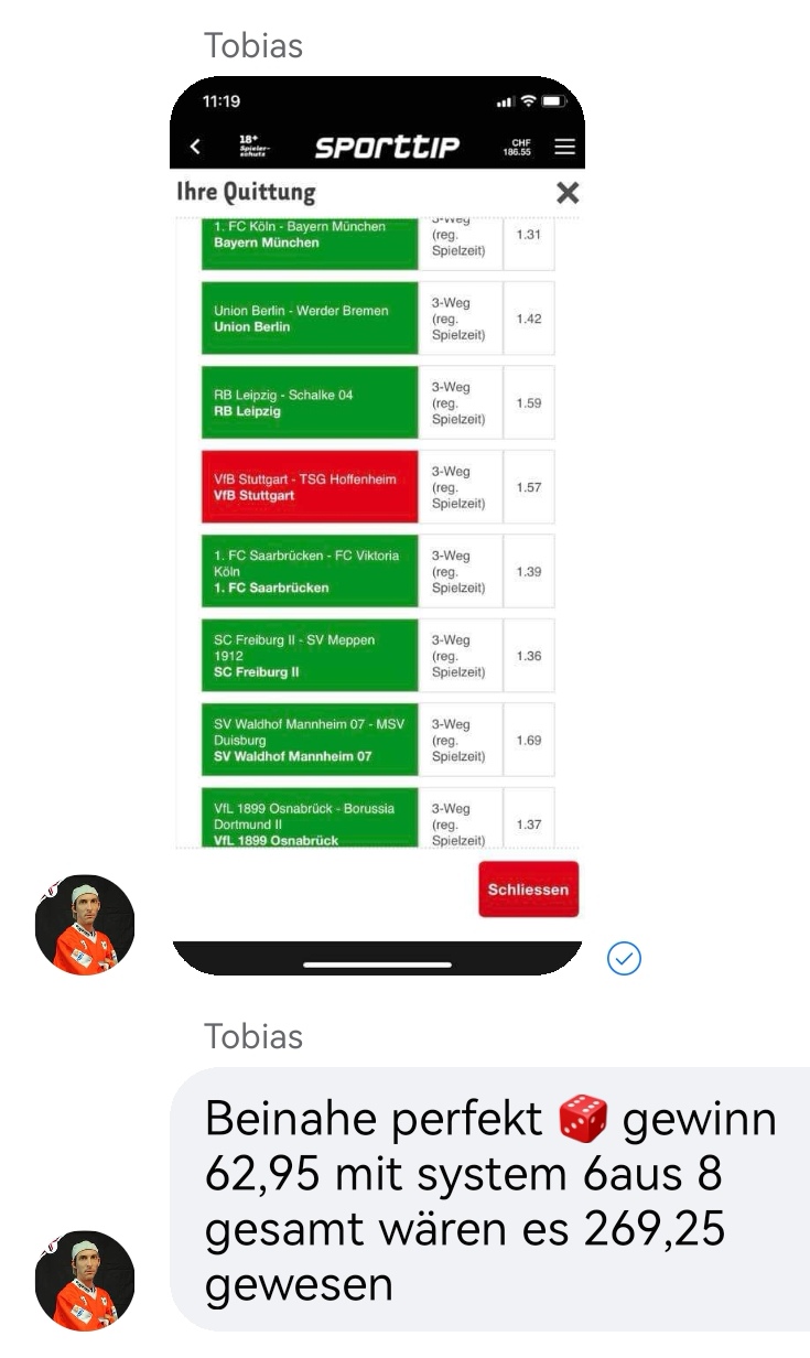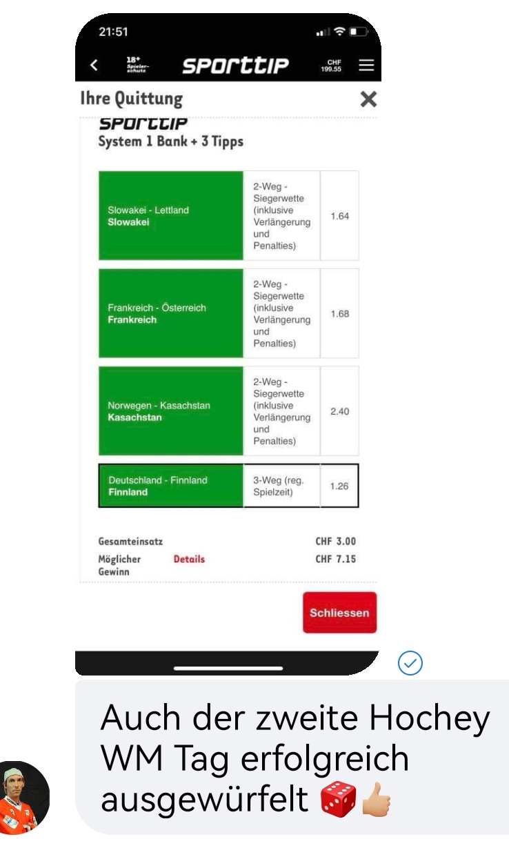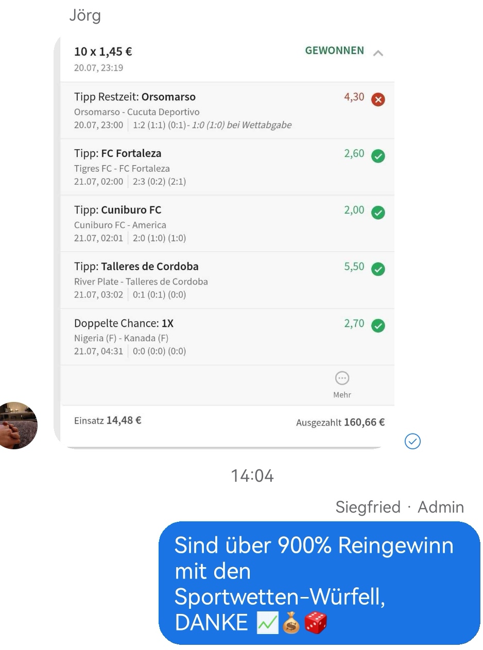 • Ab 2024 habe ich aus Zeitgründen das Einstellen von weiteren Bildern eingestellt. Die Erfolgserwartungen haben sich bestätigt und damit die Logik der mathematischen Sportwetten Würfel.