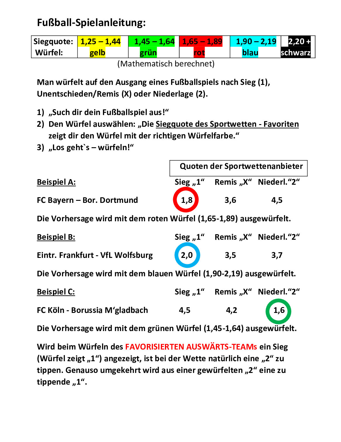Hinweis: Ist der Favorit die AUSWÄRTSMANNSCHAFT, so bedeutet eine gewürfelte „1“ (=Sieg) logischerweise einen „Sieg des Favoriten“ und somit ist eine“2″ zu spielen.